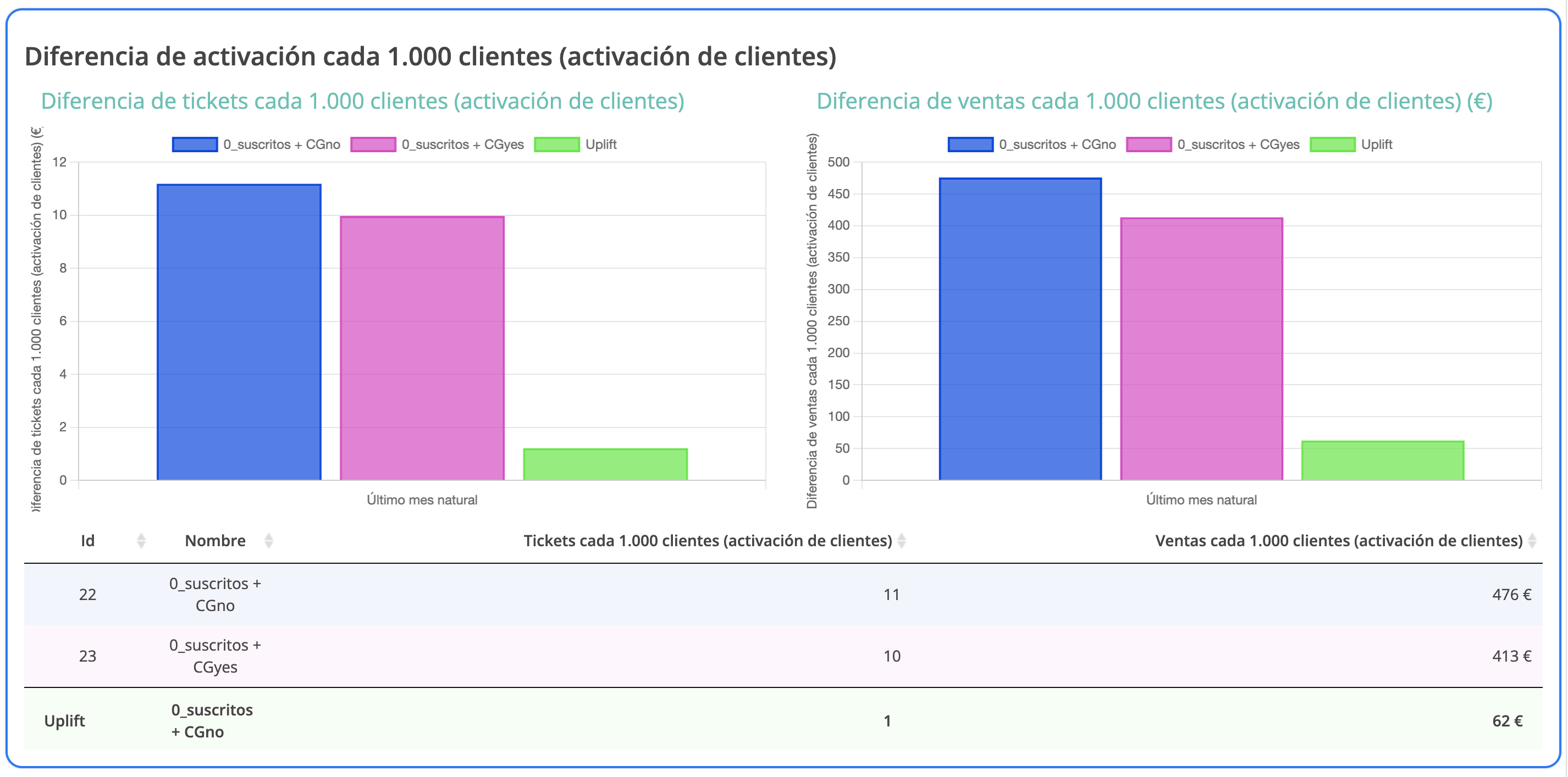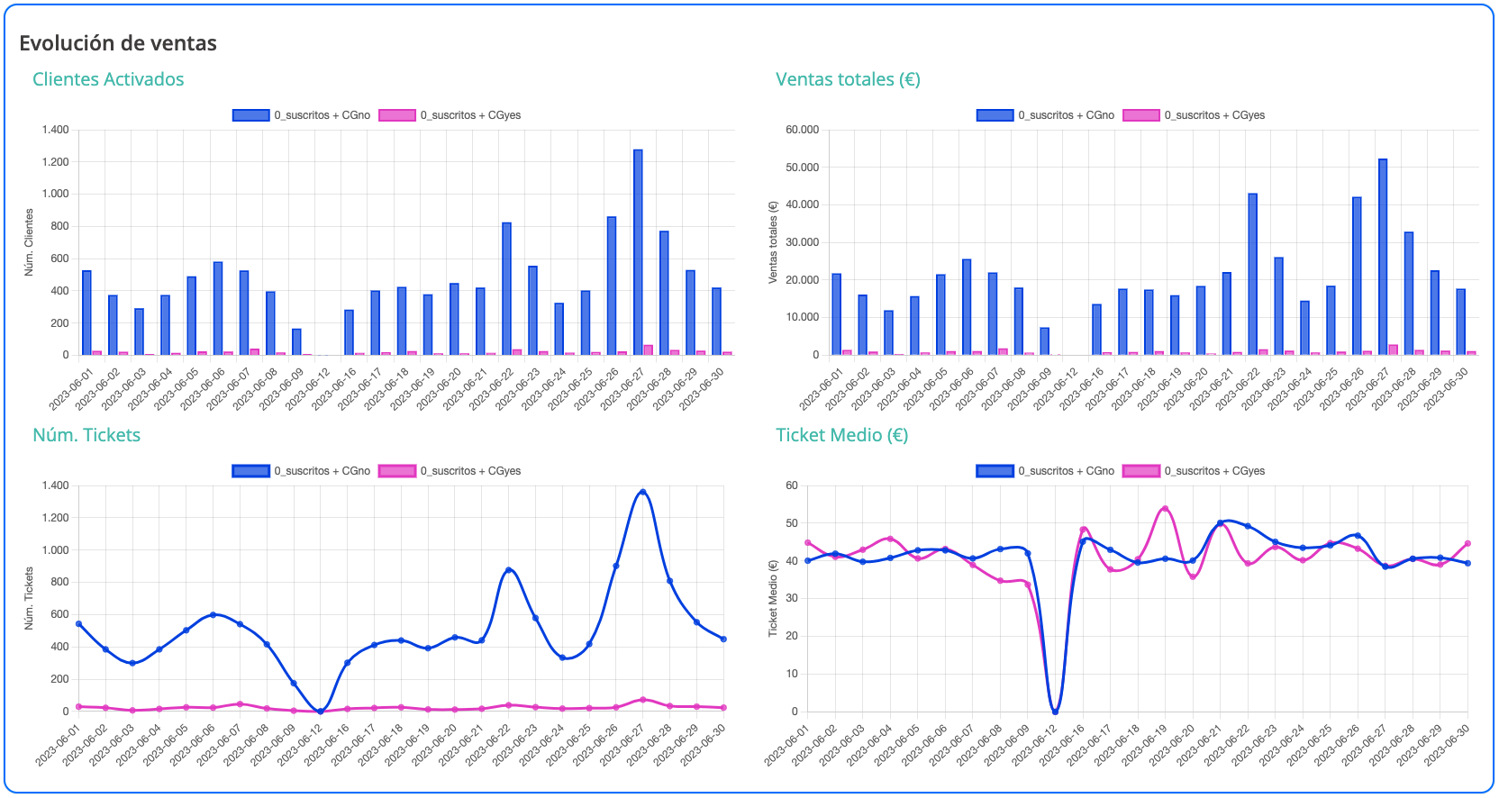 En volumen total de clientes activados, ventas totales y número de tickets no podemos comparar ambos grupos, puesto que estamos ante volúmenes muy distintos de clientes.