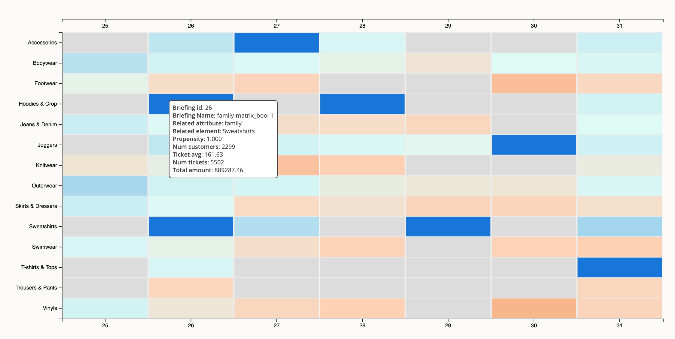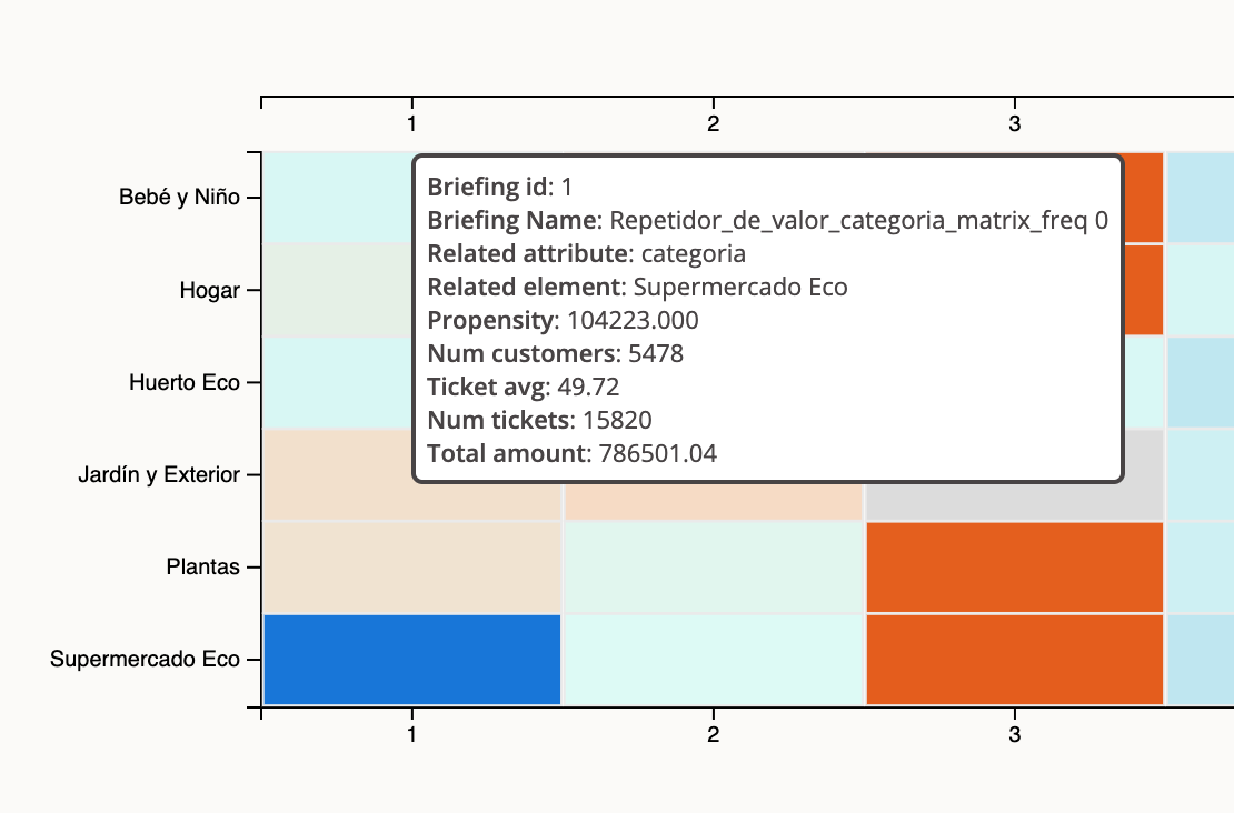 Importante! Cuanto más azul es una celda, mayor es la propensión hacia aquel eje, mientras que cuanto más rojo menos propenso es ese cliente a comprar un determinado producto.