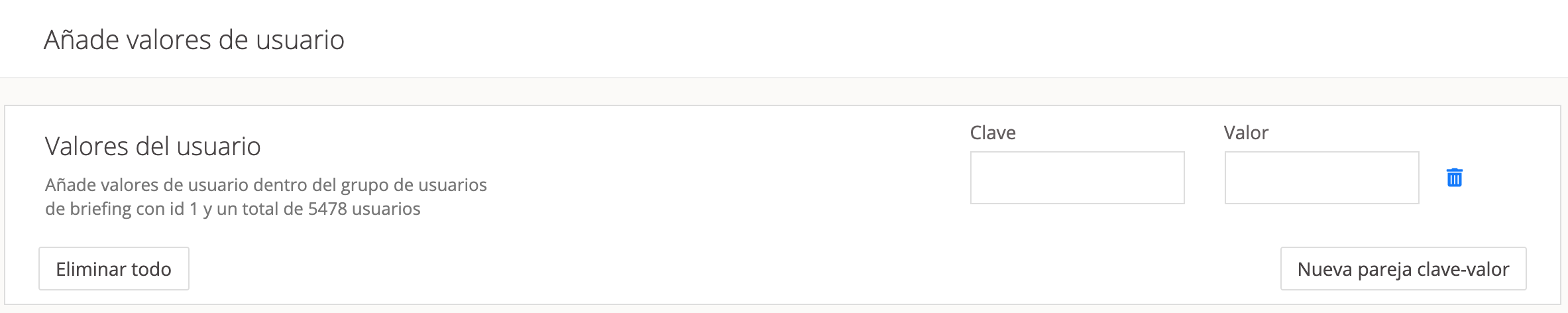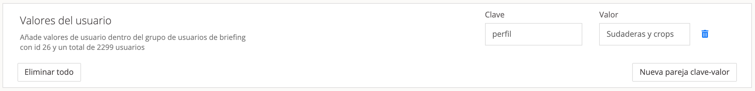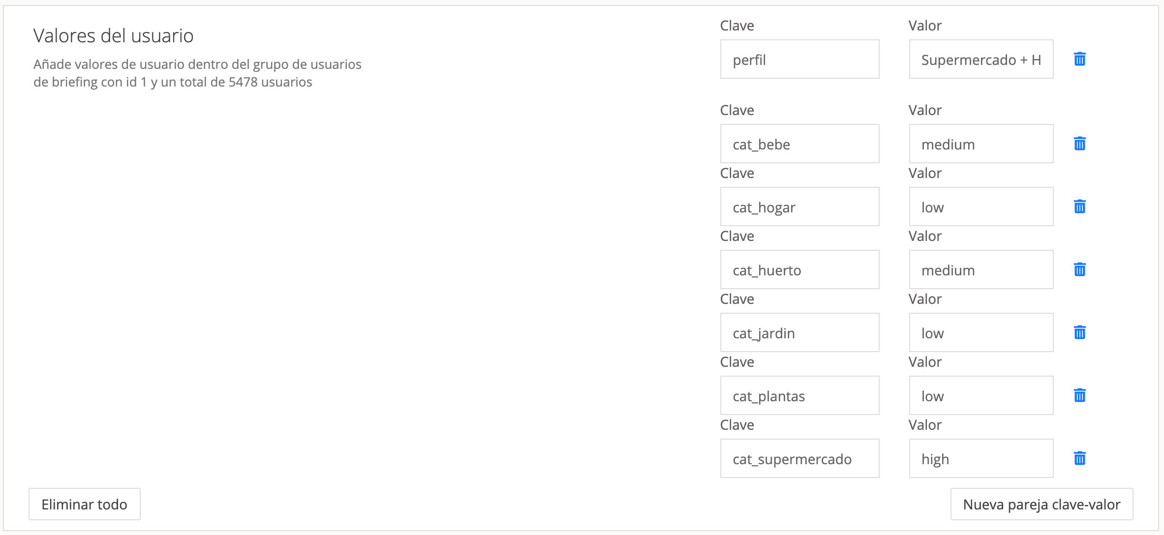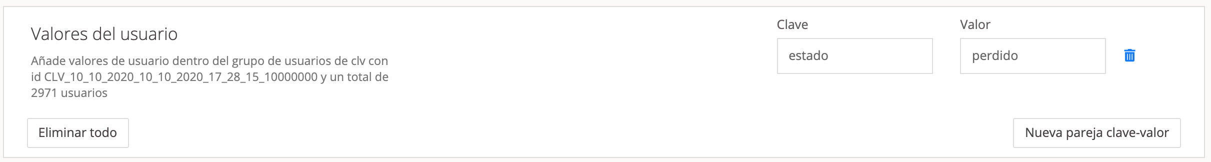Haciendo click a Nueva pareja clave-valor añadirás más atributos a todos los clientes del cluster. Haciendo click a Eliminar todo podrás empezar de zero la configuración de enriquecimiento.