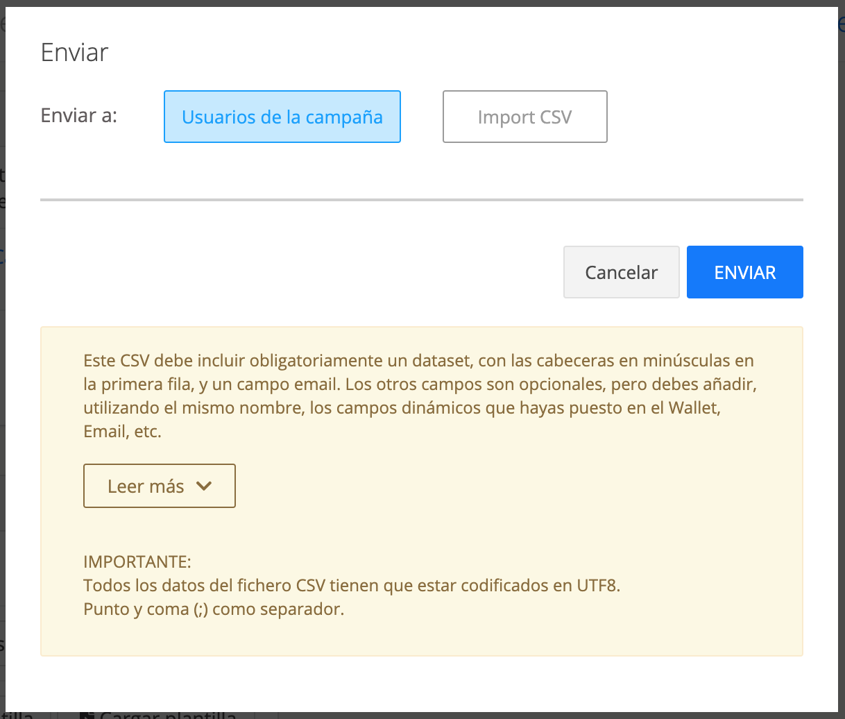 Para realizar un envío de test utiliza la opción de Import CSV. Una vez estés confortable con el email que quieres enviar haz sobre Usuarios de la campaña y haz click a Enviar.