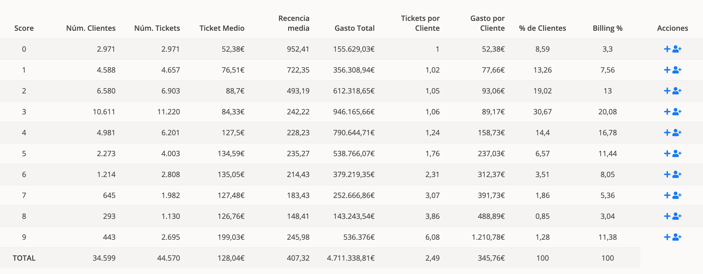 - Inactivo: Hace un mínimo de 6 meses que no nos compran pero no supera el año de la última compra. Recencia media entre 182 y 365 días.