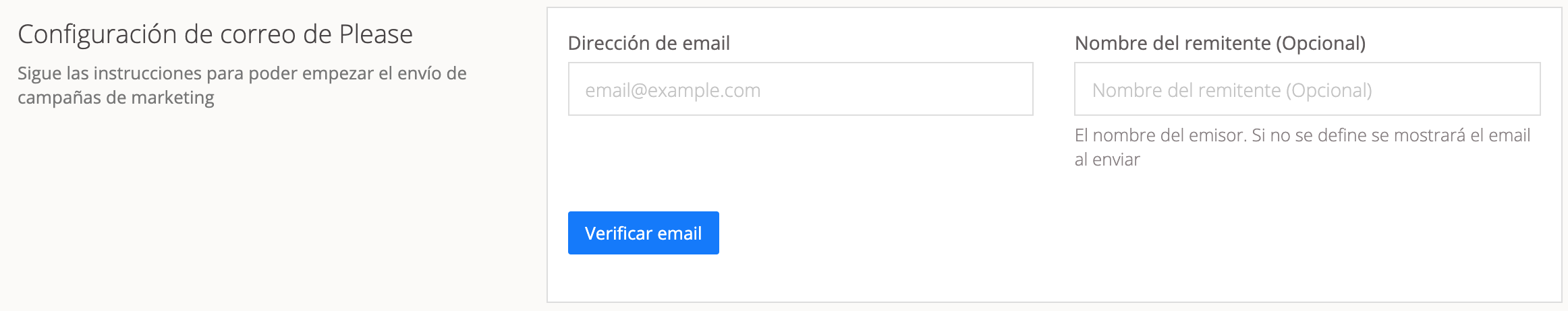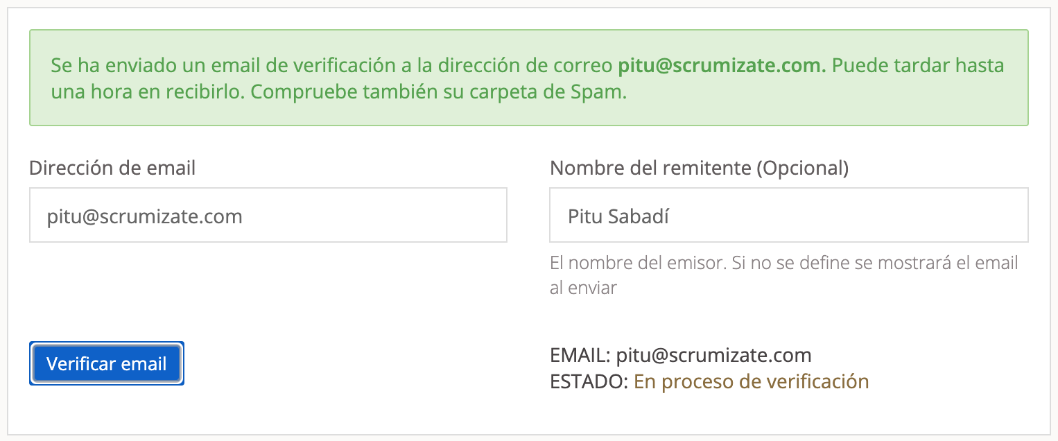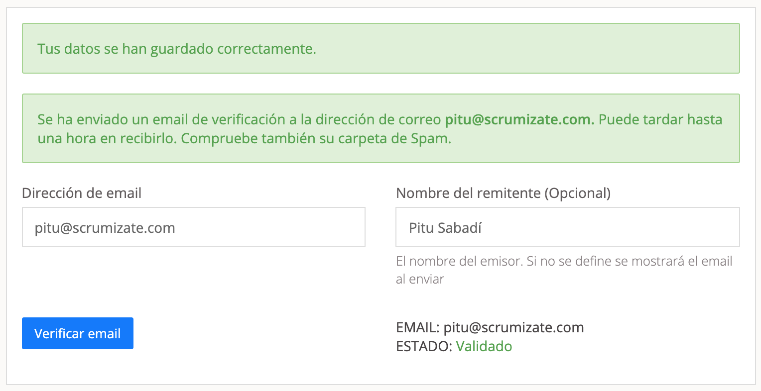 Ahora rellena el formulario con tu dirección de email y el nombre que quieres que se utilice como remitente.