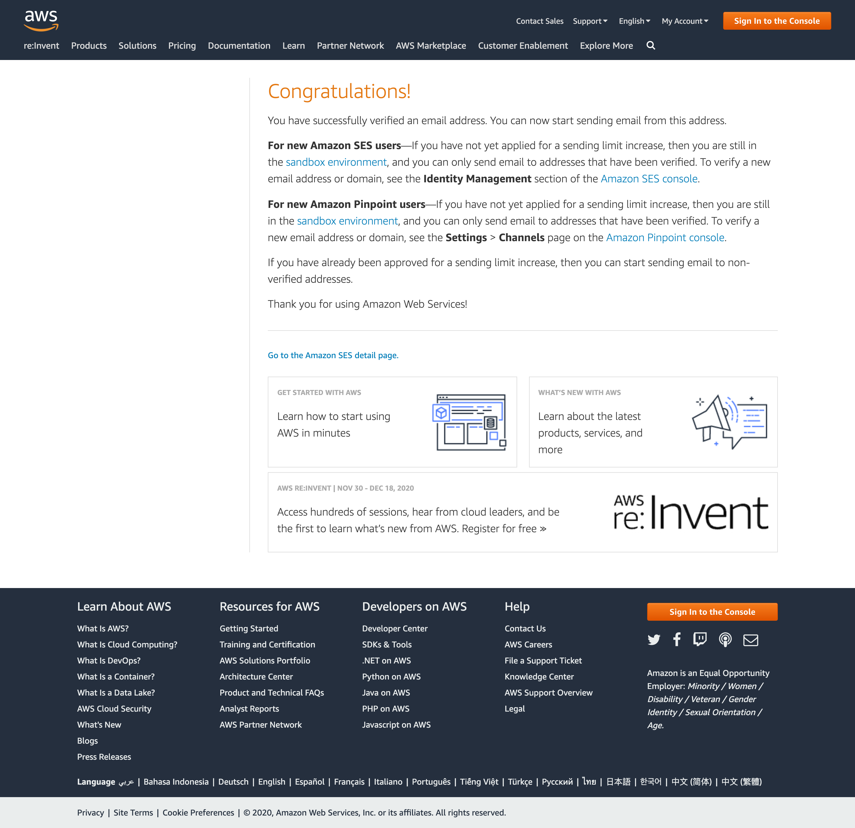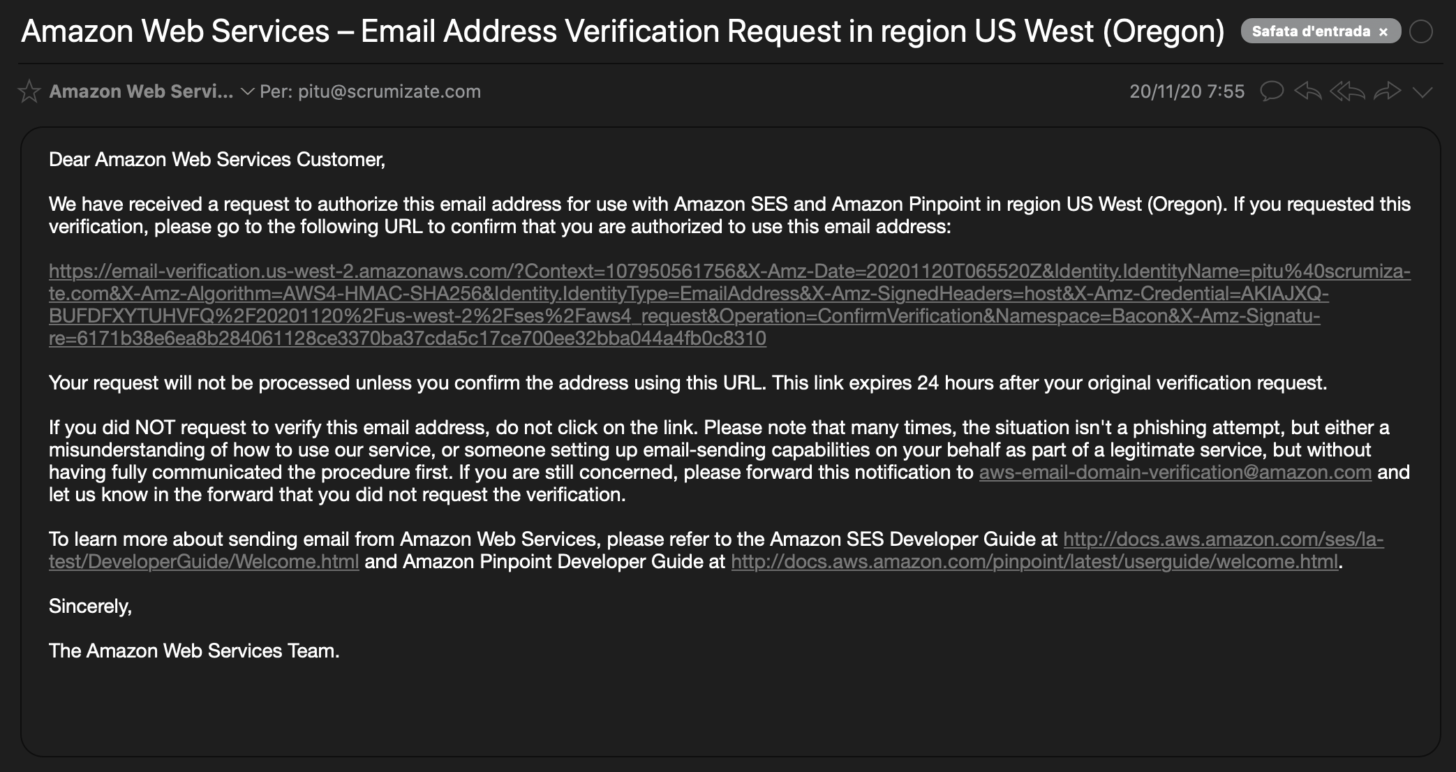 Ahora accede a la bandeja de entrada del correo electrónico que acabas de entrar. Recibirás un email de Amazon Web Services solicitando la verificación de la dirección email.
