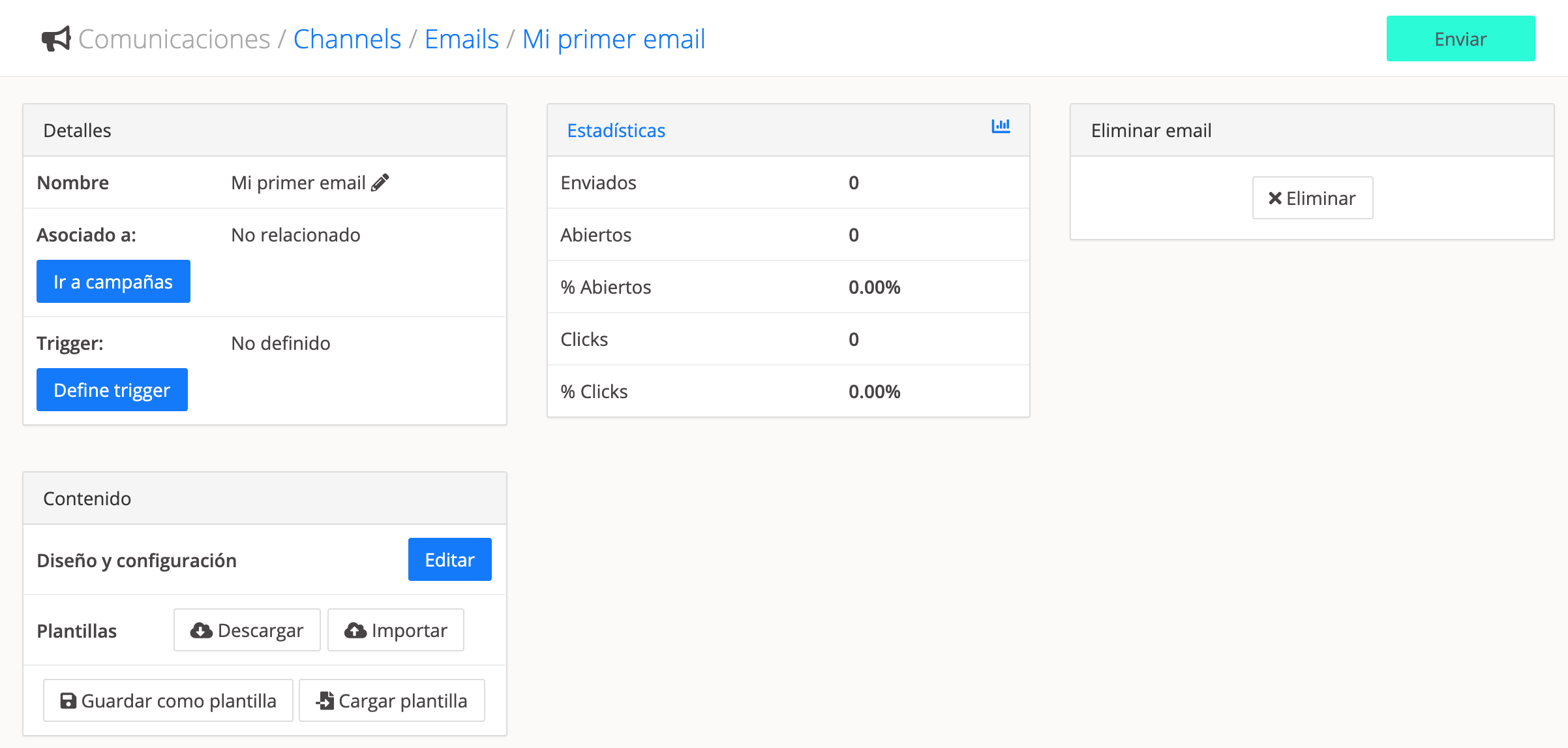 Es el momento de hacer el primer envío de test. En la barra lateral haz click a Comunicaciones y en el apartado Email.