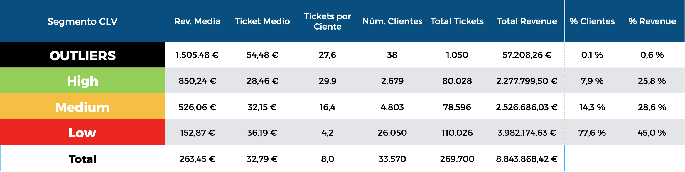 - El 77,7% de los clientes tan solo representan el 45% de la facturación global. Son los clientes de bajo valor (low).
