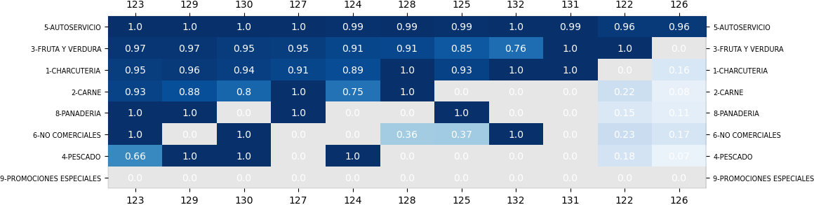 - Cuanto más intenso és el azul de cada una de las celdas mayor es la propensión de compra de los clientes del grupo hacia aquella categoría concreta.