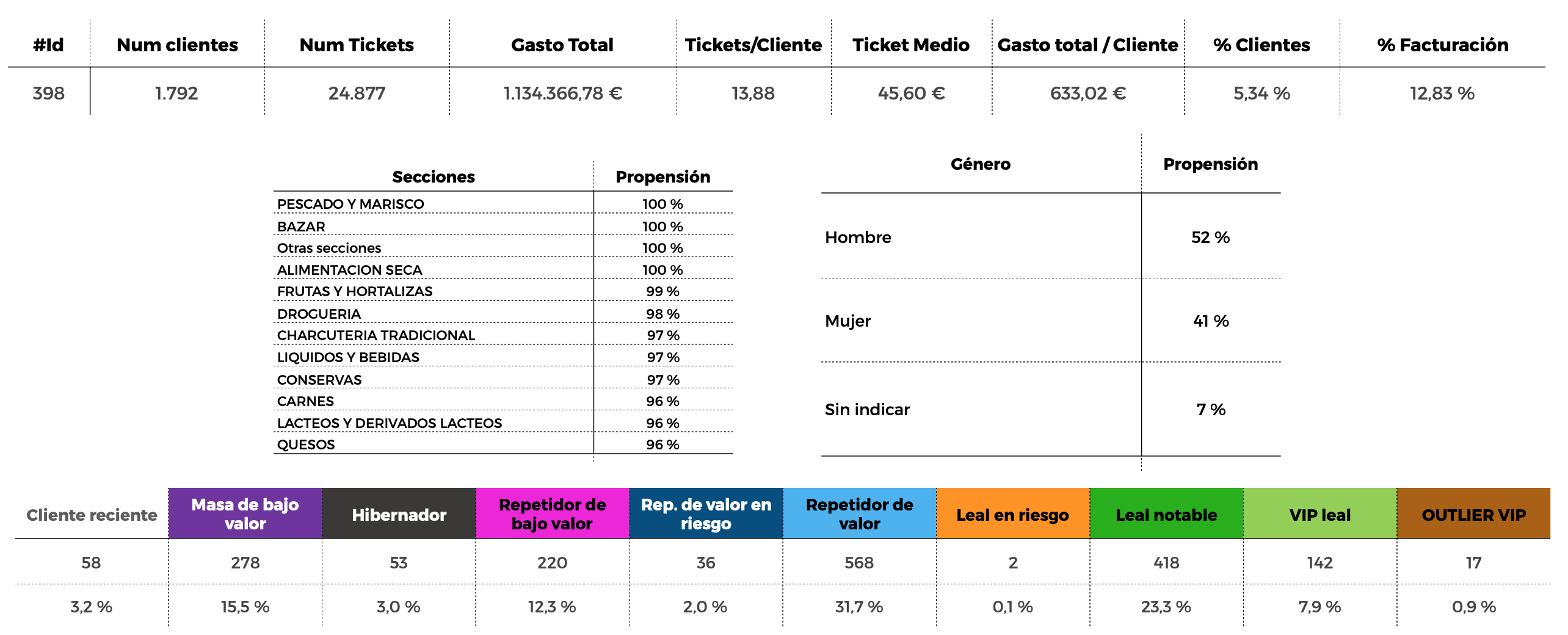 Calculamos la propensión hacia cada uno de los ejes de información relevantes para perfilar los clientes y entender sus gustos y preferencias.